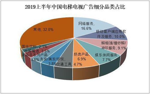 從電梯電視廣告來看,2019年上半年中國電梯電視廣告細(xì)分品類占比最大的為網(wǎng)絡(luò)服務(wù),占比達(dá)16.6%,其次為移動(dòng)客戶端應(yīng)用軟件及服務(wù),占比10%,照相館/婚紗照/沖印服務(wù)占比為9.1%,排名第三,娛樂休閑服務(wù)和奶粉產(chǎn)品分別占比7.7%、6.9%,排名第四、五位。