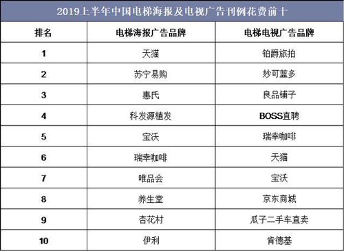 2019年上半年中國電梯海報(bào)廣告刊例花費(fèi)放緩,但食品、飲料等行業(yè)的花費(fèi)增長顯著,其中電梯海報(bào)廣告排名前五大的品牌分別為天貓、蘇寧易購、惠氏、科發(fā)源植發(fā)和寶沃。電梯電視廣告媒體高度依賴頭部品牌,其中2019年上半年排名前五大的品牌分別為鉑爵旅拍、妙可藍(lán)多、良品鋪?zhàn)印OSS直聘和瑞幸咖啡。