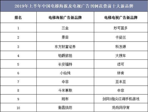 隨著傳統(tǒng)品牌廣告主對(duì)電梯廣告媒體的認(rèn)可度逐漸提升,電梯電視/電梯海報(bào)新品牌數(shù)量大幅增長,2019年上半年中國電梯海報(bào)廣告刊例花費(fèi)前五大新品牌分別為三金、景田、東方財(cái)富證券、鉑爵旅拍和長安福特,電梯電視廣告刊例花費(fèi)前五大新品牌分別為妙可藍(lán)多、卡姿蘭、科發(fā)源、大搜車和添可。